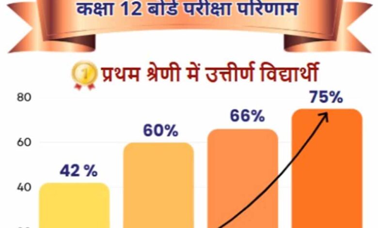 कक्षा 12वीं में उत्तीर्ण विद्यार्थियों का प्रतिशत वर्ष 2023 के 59 प्रतिशत की तुलना में वर्ष 2026 में बढ़कर 87 प्रतिशत से अधिक हो गया। वहीं प्रथम श्रेणी में उत्तीर्ण विद्यार्थियों का प्रतिशत 42 से बढ़कर 75 प्रतिशत तक हो गया।