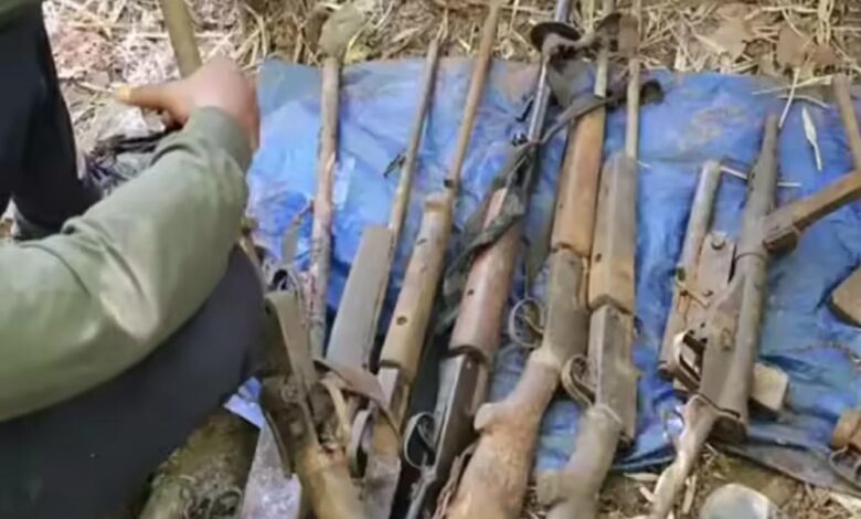 बरामद सामग्री में चार सेमी-ऑटोमैटिक राइफल, एक ग्रेनेड लॉन्चर, एक बोल्ट एक्शन राइफल और आठ पंप एक्शन सिंगल शॉट राइफल शामिल हैं। इसके अलावा एक देसी कट्टा, 451 राउंड कारतूस और 26 मैगजीन भी मिली हैं।