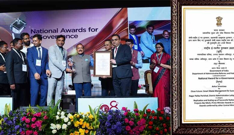 राष्ट्रीय ई-गवर्नेस पुरस्कार 2025 (जूरी) के लिए नगर पालिका परिषद, ललितपुर को उत्तर प्रदेश में सतत विकास हेतु स्मार्ट अपशिष्ट प्रबंधन के लिए चयनित किया गया है, जिसके लिए तत्कालीन #जिलाधिकारी IAS अक्षय त्रिपाठी जो अब बहराइच के #कलेक्टर है और ललितपुर अपर जिलाधिकारी वित्त एवं राजस्व #PCS अंकुर श्रीवास्तव, को पुरस्कार कार्मिक, लोक शिकायत और पेंशन राज्य मंत्री डॉ. जितेंद्र सिंह द्वारा आंधप्रदेश के जिला विशाखापट्नम में आयोजित कार्यक्रम में भारत सरकार के प्रशासनिक सुधार और लोक शिकायत विभाग द्वारा श्रेणी-राष्ट्रीय ई-गवर्नेस पुरस्कार, प्रधानमंत्री उत्कृष्टता पुरस्कार, अन्य केन्द्रीय मंत्रालयों द्वारा प्रदान किए गए पुरस्कारों जैसी सफल राष्ट्रीय स्तर की पुरस्कृत परियोजनाओं की पुनरावृत्ति और उनके विचार के लिए नगर पालिका परिषद, ललितपुर उत्तर प्रदेश को स्वच्छ भविष्य ललितपुर, उत्तर प्रदेश में सतत विकास हेतु स्मार्ट अपशिष्ट प्रबंधन के लिए नगर पालिका परिषद, ललितपुर को राष्ट्रीय-ई-गवर्नेस पुरस्कार 2025 (जूरी) से सम्मानित किया गया है