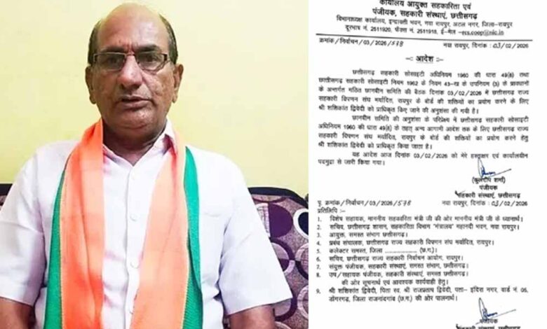 राज्य सहकारी विपणन संघ मर्यादित बोर्ड की शक्तियों का प्रयोग करने शशिकांत द्विवेदी को प्राधिकृत किया गया है, जारी आदेश में लिखा है, छत्तीसगढ़ सहकारी सोसाइटी अधिनियम 1960 की धारा 49 ( 8 ) तथा छत्तीसगढ़ सहकारी सोसाइटी नियम 1962 के नियम 43-ख के उपनियम (3) के प्रावधानों के अन्तर्गत गठित छानबीन समिति की बैठक दिनांक 03/02/2026 में छत्तीसगढ़ राज्य सहकारी विपणन संघ मर्यादित, रायपुर के बोर्ड की शक्तियों का प्रयोग करने के लिए शशिकांत द्विवेदी को प्राधिकृत किए जाने की अनुशंसा की गयी है। छानबीन समिति की अनुशंसा के परिप्रेक्ष्य में छत्तीसगढ़ सहकारी सोसाइटी अधिनियम 1960 की धारा 49 ( 8 ) के तहत् अन्य आगामी आदेश तक के लिए छत्तीसगढ़ राज्य सहकारी विपणन संघ मर्यादित, रायपुर के बोर्ड की शक्तियों का प्रयोग करने हेतु शशिकांत द्विवेदी को प्राधिकृत किया जाता है। यह आदेश आज दिनांक 03/02/2026 को मेरे हस्ताक्षर एवं कार्यालयीन पदमुद्रा से जारी किया गया ।