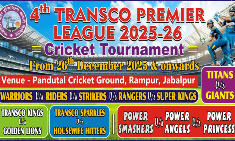 एम.पी. ट्रांसको (मध्यप्रदेश पावर ट्रांसमिशन कंपनी) मुख्यालय, जबलपुर में अंतरविभागीय वार्षिक खेलकूद प्रतियोगिता के अंतर्गत “ट्रांसको प्रीमियर क्रिकेट लीग–2025-26” का आयोजन 26 दिसम्बर 2025 से किया जा रहा है।प्रतियोगिता के संयोजक कार्यपालन अभियंता श्री इकबाल खान ने बताया कि टेनिस बॉल से खेली जाने वाली इस प्रतियोगिता के सभी लीग एवं फाइनल मुकाबले रामपुर स्थित पांडुताल खेल प्रांगण में आयोजित किए जाएंगे।